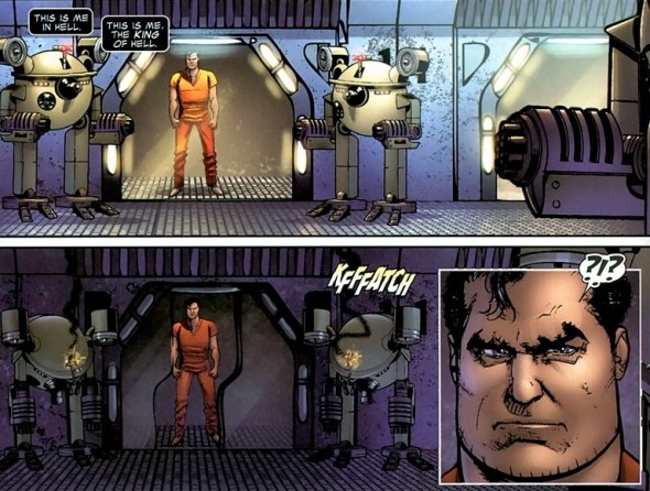 Not anymore. Y’see, this arc ties in with the major Marvel event Secret Invasion. The shape-shifting Skrull aliens have invaded Earth and the world turns into a battlefield. Part of their military strategy involves disabling every bit of technology ever created by Tony Stark, like say, prison cells.