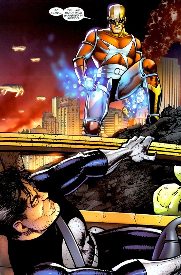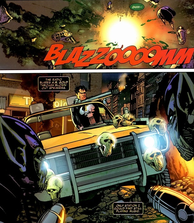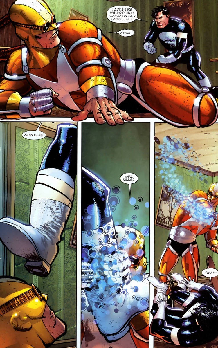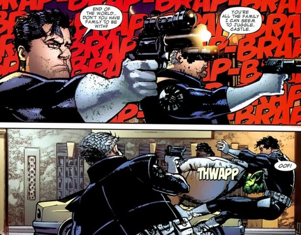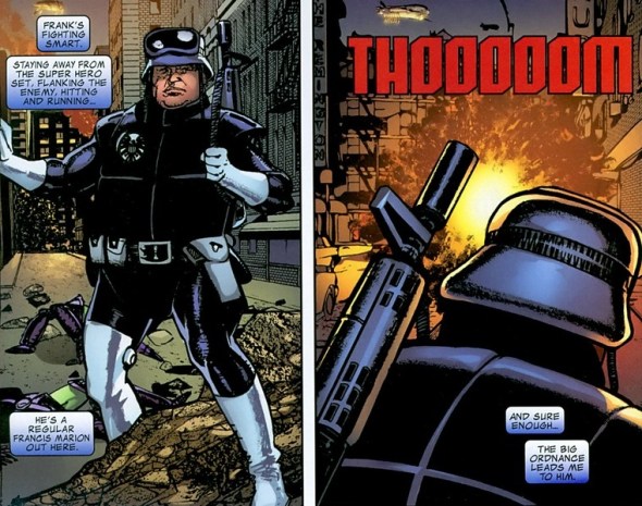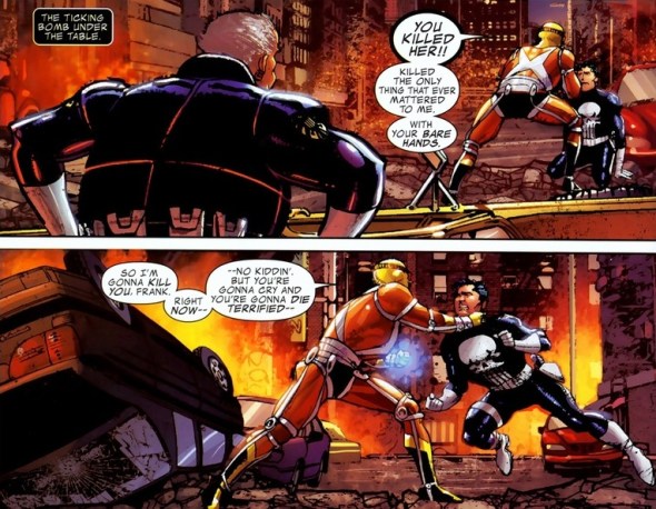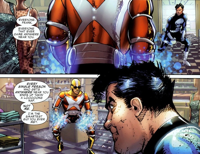 Doesn’t sound exciting, I know. But unlike most tech guys the Punisher hangs around with, Clarke used to be the supervillain Rampage. Like a cool armor/weapon suit that shoots flames and lasers and stuff. Oh, about fifteen issues before this, Castle came under the influence of some rage gas or something and strangled Clarke’s girlfriend to death.