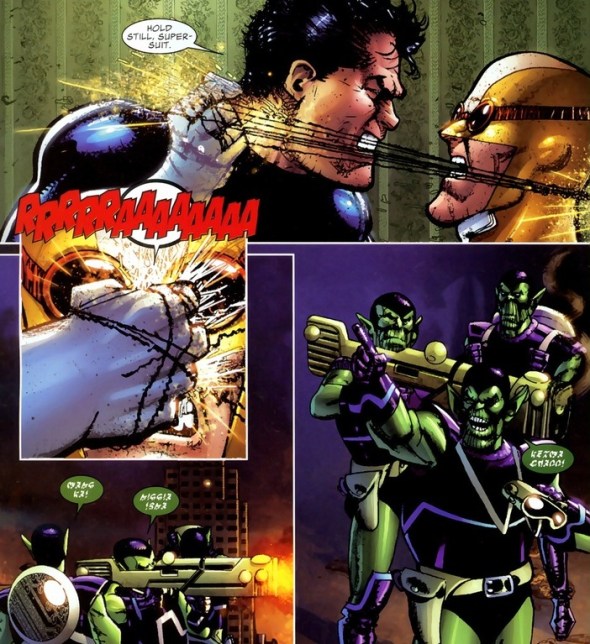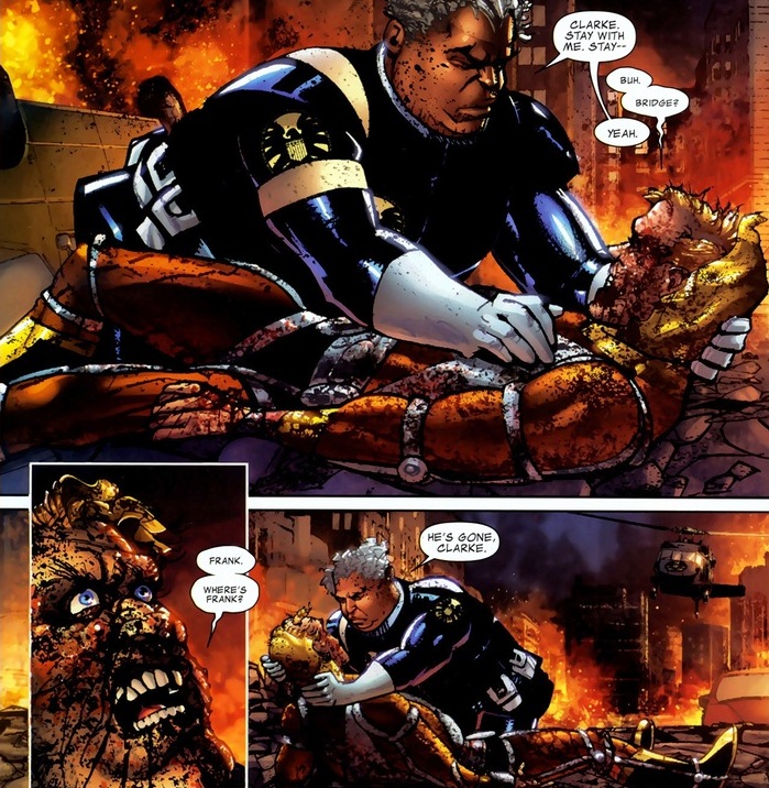 Our wonderful G. W. Bridge, SHIELD agent extraordinaire, and the one not headbutted by a giant Skrull. The fight goes as badly as you would expect from one invincible alien versus two old men. But because the story involves Castle and Clarke, our ex-supervillain rises from the ashes of his dusty computer hideout to burst into the fiery streets of the warring city.