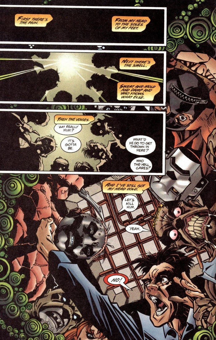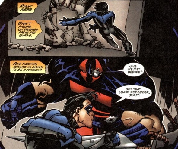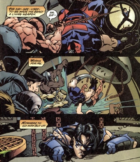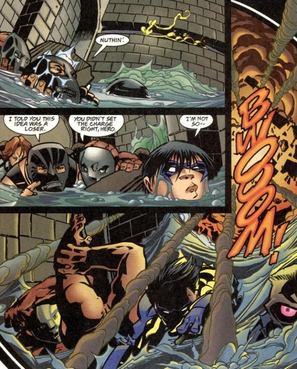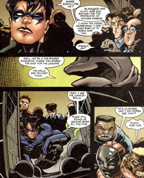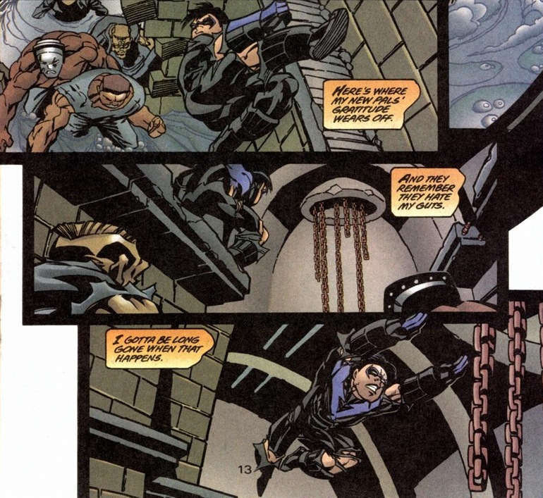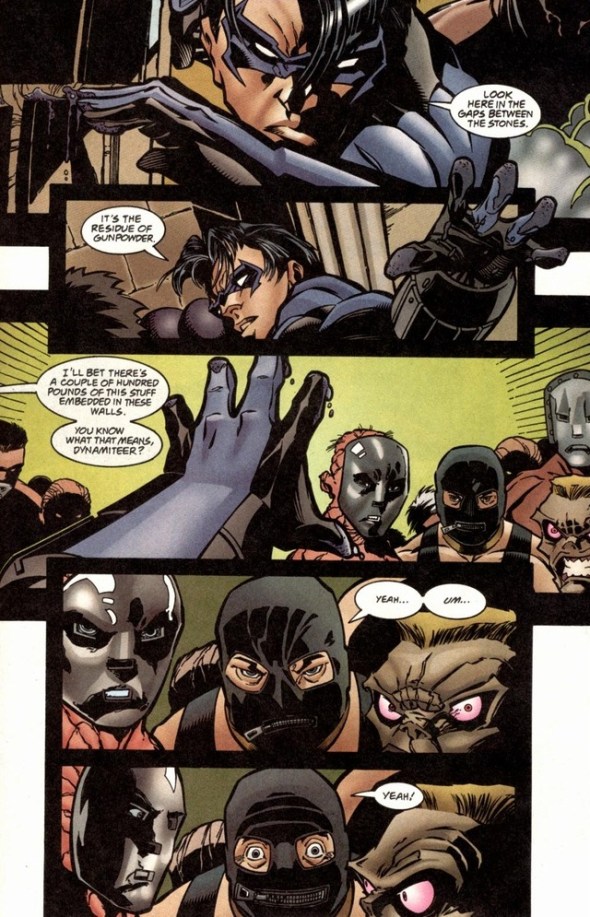I love comics because of situations like this one, where Nightwing’s now trapped in an impenetrable basement pit with twenty enraged baddies. You and I get to wonder how he’ll get out of this mess, even more so after the villains realize that Batman ain’t coming to rescue them. They get stuck with the former Boy Wonder. What a terribly rude way for Batman to treat all those people he’s given concussions.