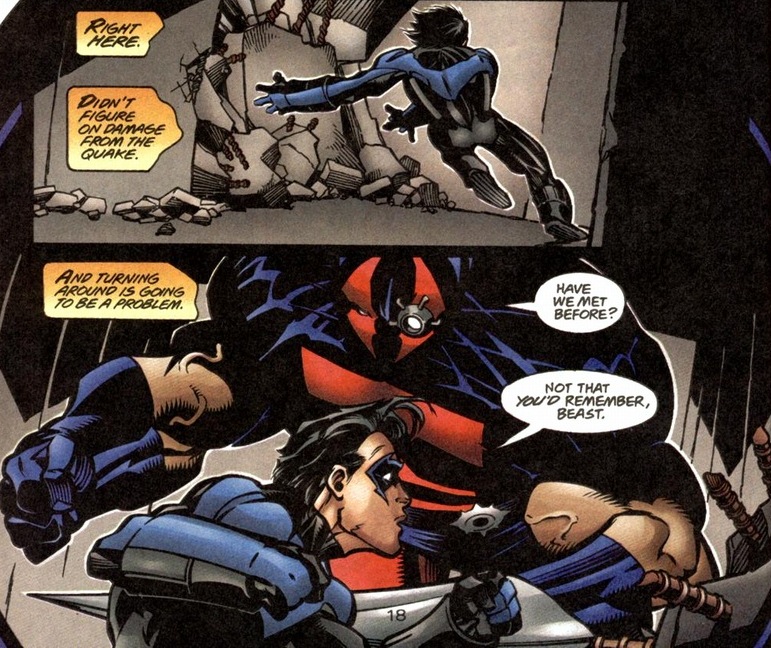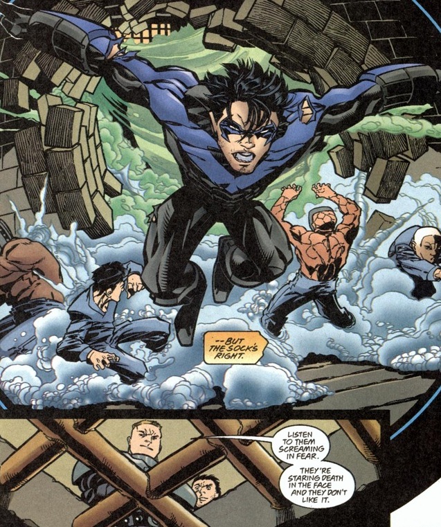 “Nightwing’s biggest strength lies … with his natural physical gifts”: I remember that, during his short experience as Batman, Dick had a meeting with Starfire, and she told him his fight style had changed. She said that, as Robin and Nightwing, he used to move in a so fast and elegant way that he seemed to dance, instead of fight; since he started being Batman, he had begun to fight in a more rough way. That made me think about how heavily the costume a superhero wears can influence his behaviour and approach.