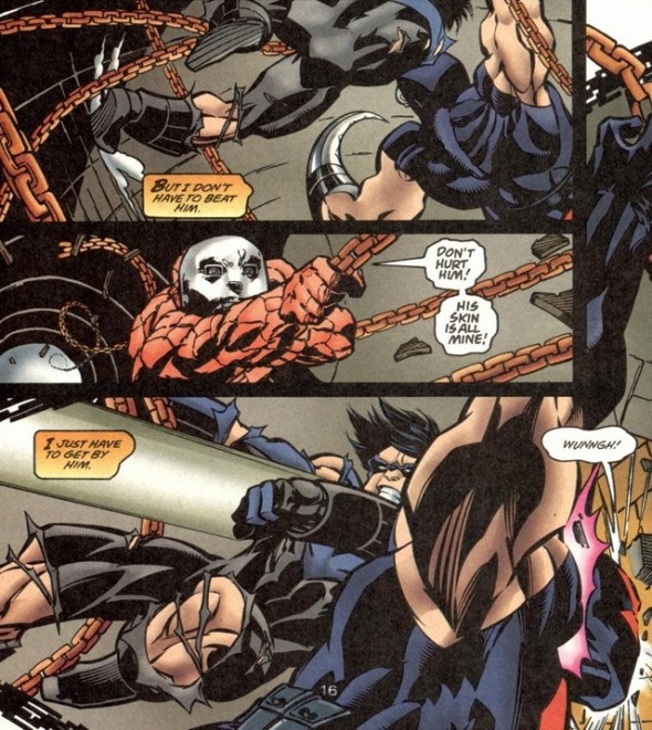 Favorite panel in the entire arc. Nothing like the pure glee of a BDSM supervillain so minor, you can count all of his issue appearances on one hand. With Nightwing’s first plan shattered into pieces, why not go for a double?
