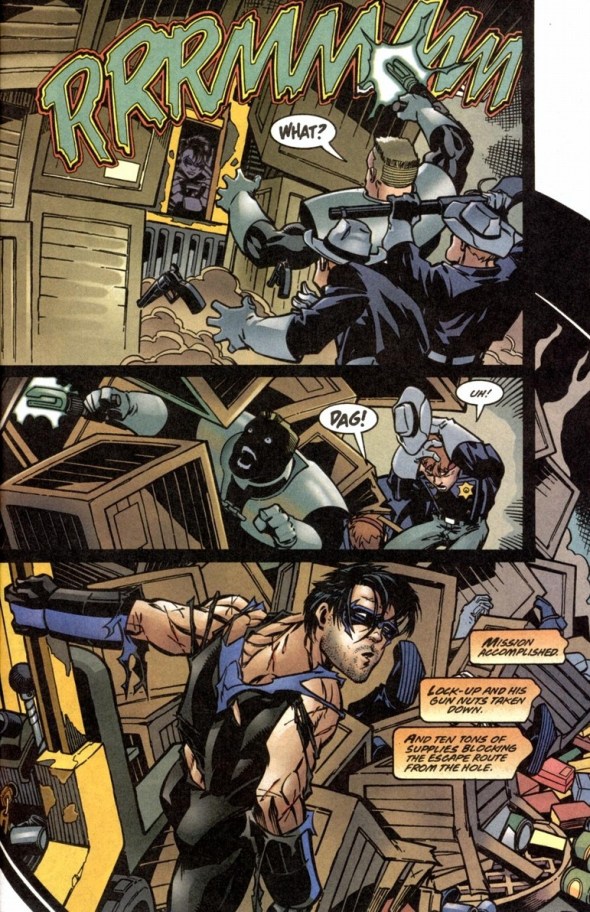 Y’know, this arc actually leads up to the Ballistic Romance story, where Nightwing meets up with his rejected lover Huntress again while rekindling his relationship with Oracle at the same time as battling a rogue police hit squad. It’s awesome.
