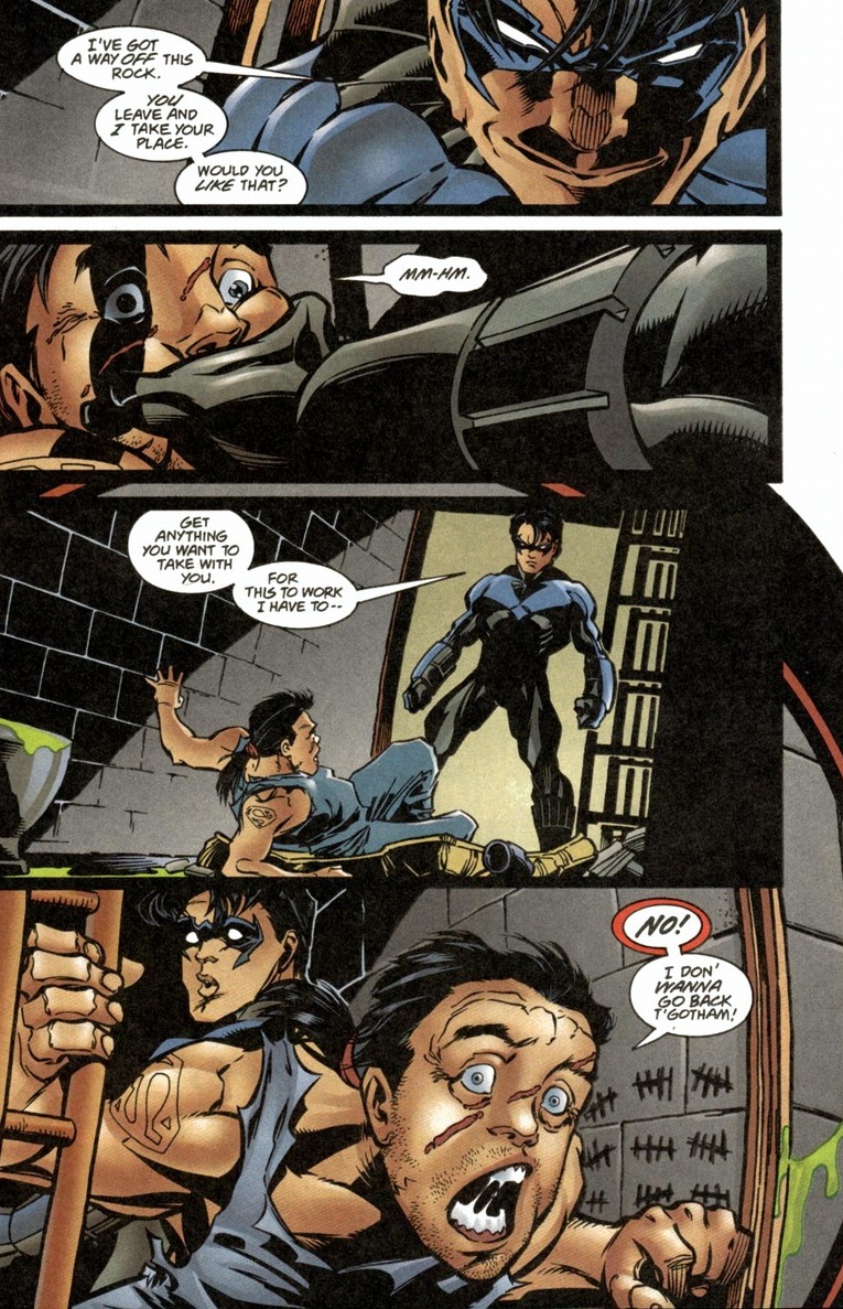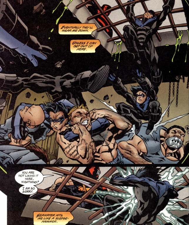 We’re speeding towards Grayson’s great escape, because as you’ve probably figured out, Nightwing’s safety depends pretty heavily on the containment of the prisoners. Thugs and supervillains totally have goldfish memory. That or an inability to properly thank the good-looking, athletic, young man who bloodied and shipped them off to the police in the first place.