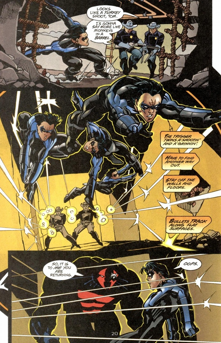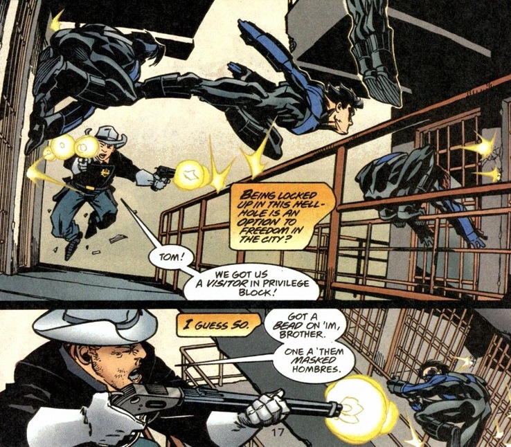 Nightwing’s biggest strength lies not with his brilliant mind (that’s Tim Drake), or his calculated ruthlessness (Jason Todd), but instead with his natural physical gifts. It’s been stated on more than one occasion that Nightwing’s even faster than Batman. Well, like by a fraction, but still faster. Surely he can outrun the rifle of a hollerin’ stereotype.