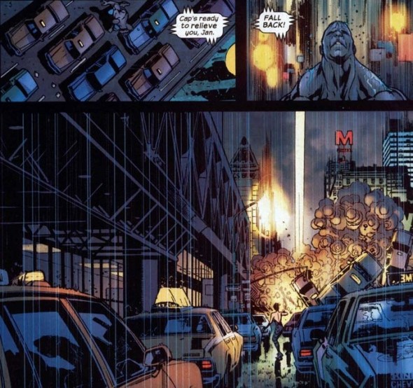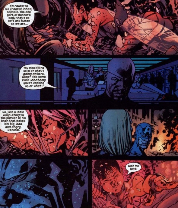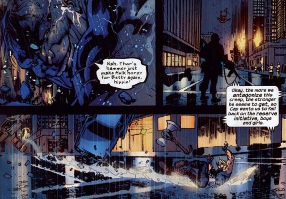 In Ultimates #5, written by Mark Millar and drawn by Bryan Hitch, the Ultimate Marvel universe’s answer to the Avengers, the team of lovable superheroes goes up against a perverted Hulk. It’s been a good eighty articles since I’ve talked about the alternative universe. I hope you don’t mind if I recycle text from my third ever article: