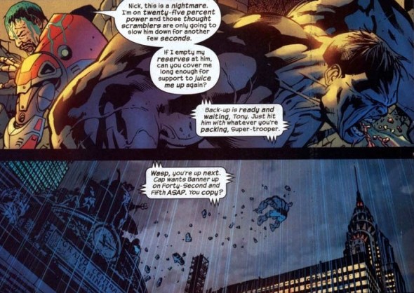 Well, that went badly. Since we’re witnessing the first real struggle against the Hulk, the Ultimates don’t fully know his true levels of strength. They’ll find out very quickly. Plan A, consisting of cupping the Hulk in giant hands, went awry quickly. Underestimation noted; time to tag in one of the heavy hitters. Meet Iron Man.