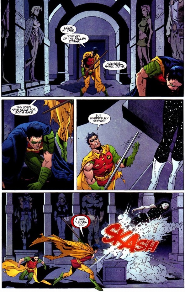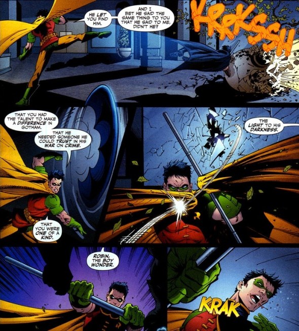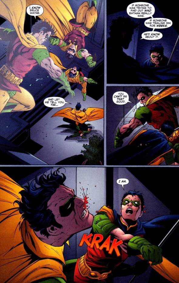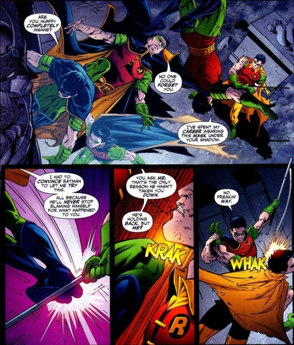 If you want to see Drake and Todd battle again, they clash in Batman: Battle for the Cowl #2.  And instead of two Robin costumes, both are wearing Batman suits.  Stuff like that just happens.  By the way on a final note, in the rebooted DC universe, Drake never became Robin, instead crime fighting as Red Robin from the moment he stepped into the Batcave.  So this story may not have ever happened in the new DC canon.  Though you know where it’ll always be alive and well?  That’s right, I’m pointing to my heart.