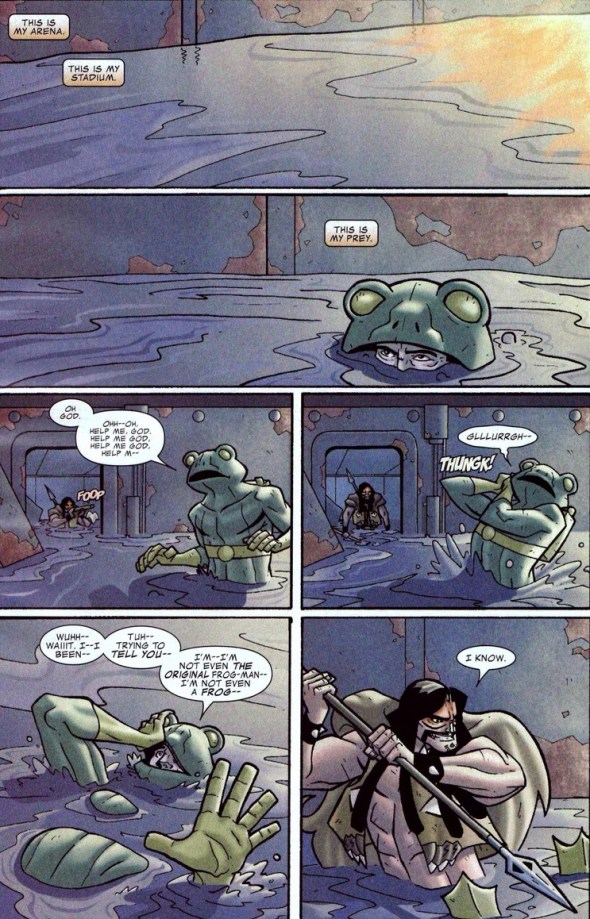 During his short and marvellous run on Daredevil, David Mack wrote an issue (or maybe an entire story arc) about Frog Man’s son: read it, it’s wonderful. That’s why I love conversations about comics: 9 times out of 10, I end up remembering a good comic book I almost forgot about, and then I search for it and read it again with so much pleasure. That’s what I’m going to do with that Daredevil issue: if I remember well, it should be right under my tv.