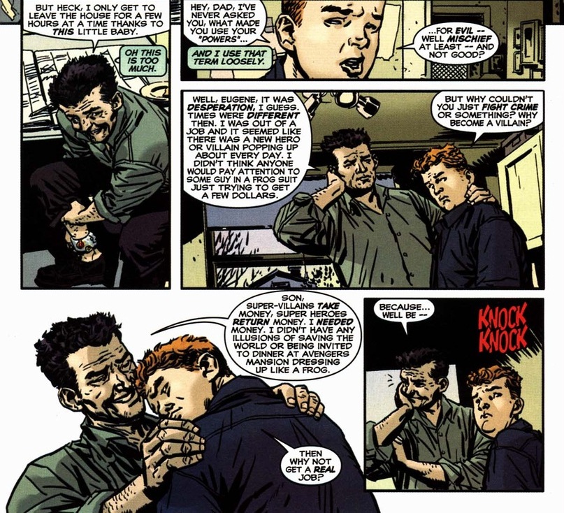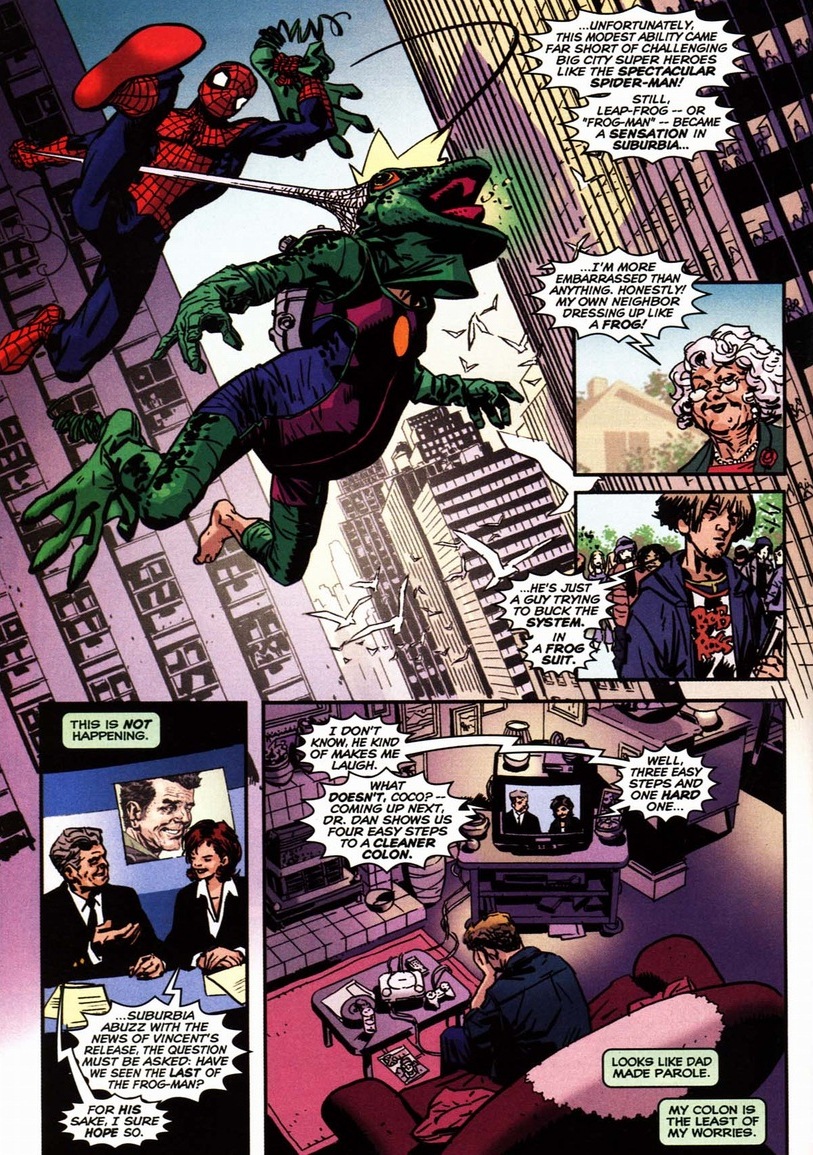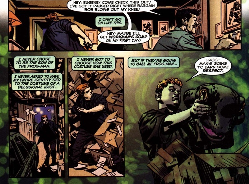 Jumping ahead ten years in comics, Frog-Man still operates in the city, albeit not much different than his previous purpose. After all, supervillains will always need bashing.