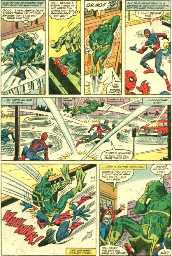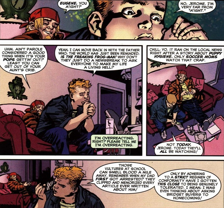 Teenage superheroes have and continue to be extremely successful. There’s totally an audience for child superheroes. All I’m saying is that Peter Parker woke up the day after his origin story with a six-pack abs and perfect vision, instead of a chunky teen squeezing into a creepy scuba suit. Immediately, Eugene served his purpose in the Marvel universe as comic fodder for the heroes he teamed up with, winning battles almost entirely through luck and accidents.