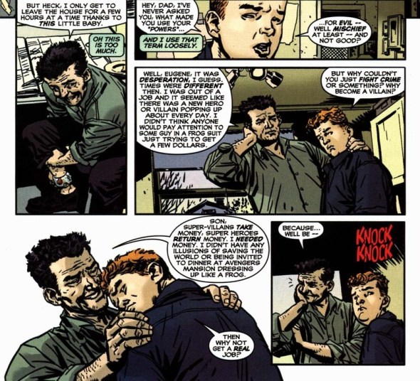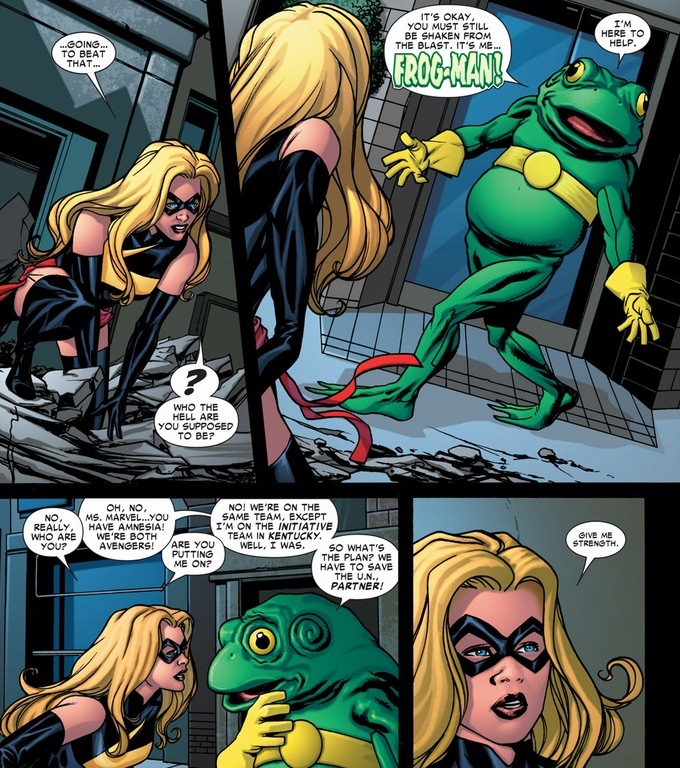 To be fair to Eugene, he has some training now. Y’see, after the Civil War, Iron Man decided to place a superhero team in all fifty states. That’s a ton of superheroes needed. Plus, who do you send to battle supervillains in states that don’t have supervillains? Absolutely, Frog-Man. The ranks stretched thin in the mid-2000s. So yes, Frog-Man is an Avenger. Sort of. If you want to see for yourself, he appeared in select issues of Avengers: The Initiative. Though I believe that Frog-Man turned out to be a secret Skrull. The Marvel universe is complicated.