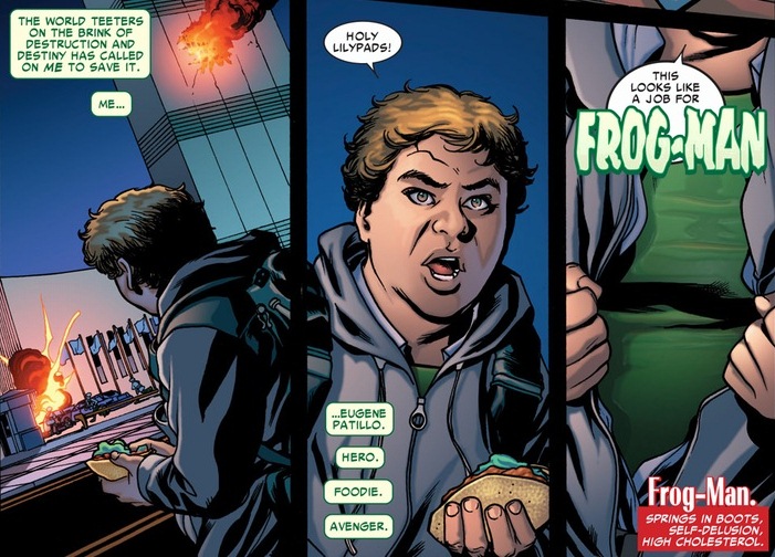 All of this leads to a single issue. During Spider-Island, the Marvel event where everyone in New York City developed spider powers, the Avengers received their very own one-shot. And in a flash of writing genius, Frog-Man showed up to protect his town:
