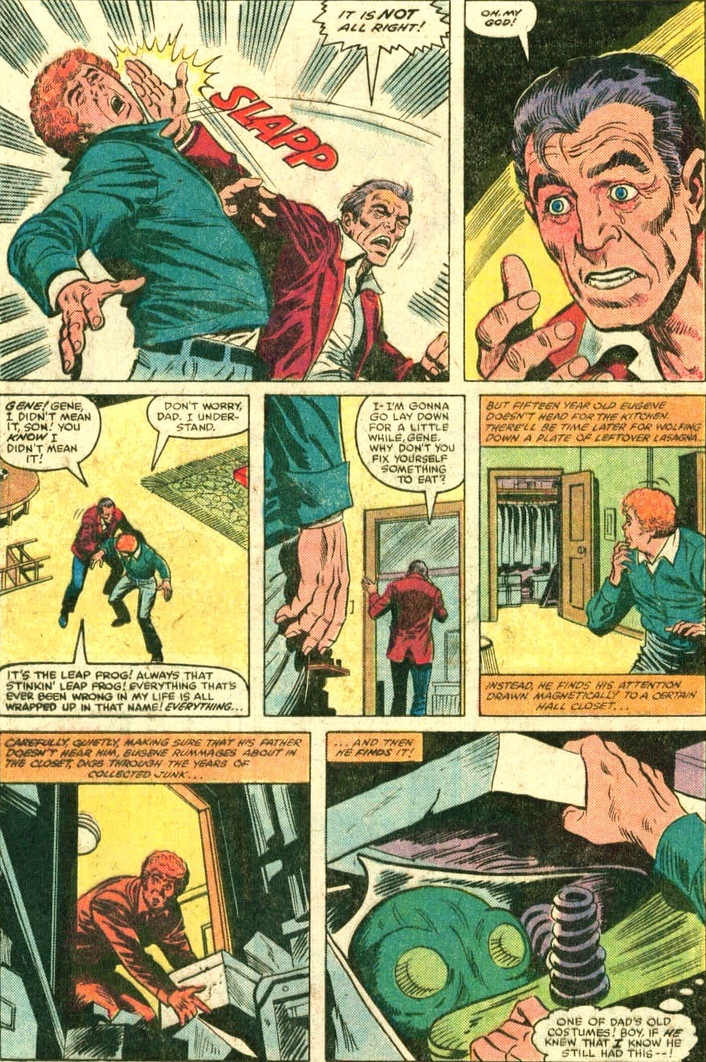 Yes, Daredevil’s never fought anyone who could move so fast before. Ever. Let’s assume this is very early in Daredevil’s crime fighting career. Writers, specifically DeMatteis, realized that selling this Leap-Frog as a serious supervillain probably won’t work in the long term. And this is in a universe where the world’s toughest men and women wear their underwear outside their pants. So, in a character-defining decision, Vincent retired from the role and his son Eugene was introduced.