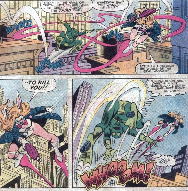And how does Frog-Man save the day? Y’know, there’s a nasty side effect involved with eating right before spending the next twenty pages flipping and jumping around. I’m just saying Captain America has never used this method to win before:
