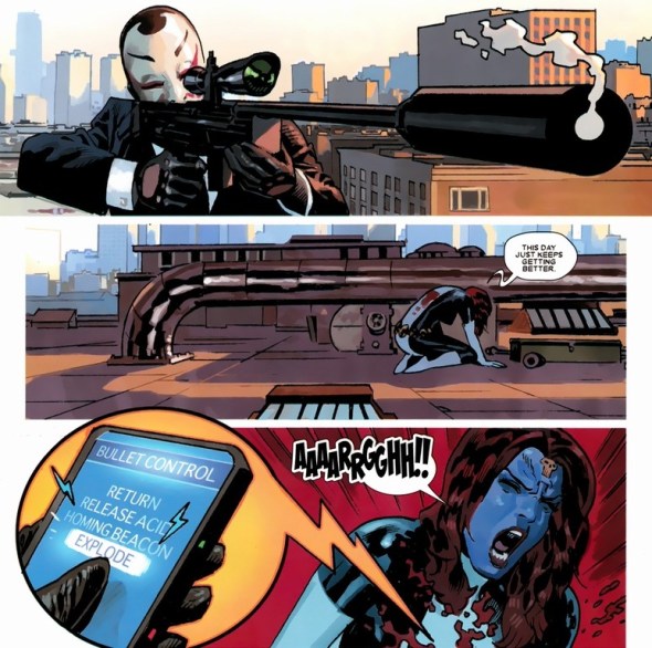 Certainly Mystique can take more punishment than a normal civilian.  Shifting her organs around or whatever.  But exploding sniper bullets?  That’s going to be harder to shake off.