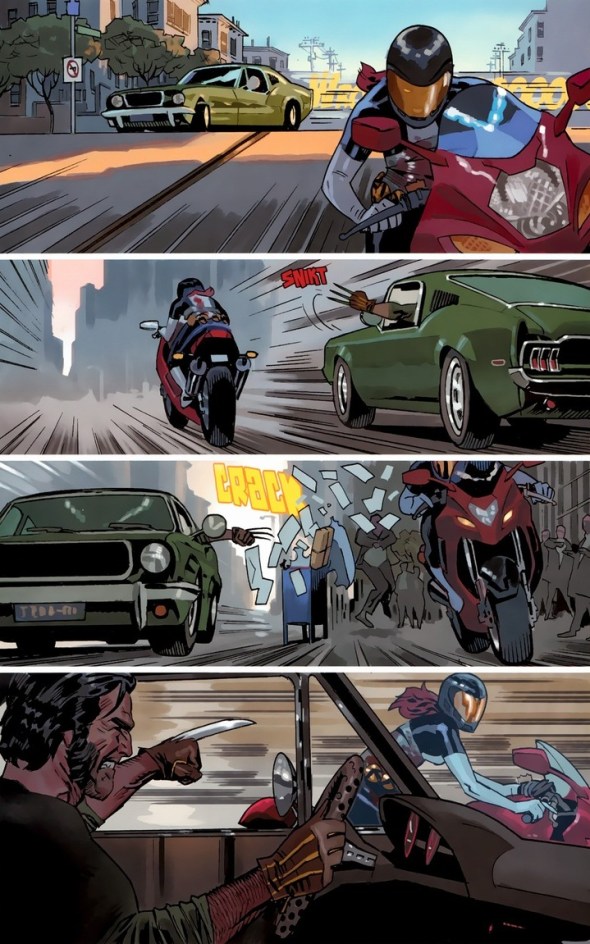 I admire Wolverine for trying to claw her by sticking his hand out the window.  Poor guy just doesn’t have any projectile superpowers.  Let’s watch as the fight becomes a crazy action movie — this issue is super fun.