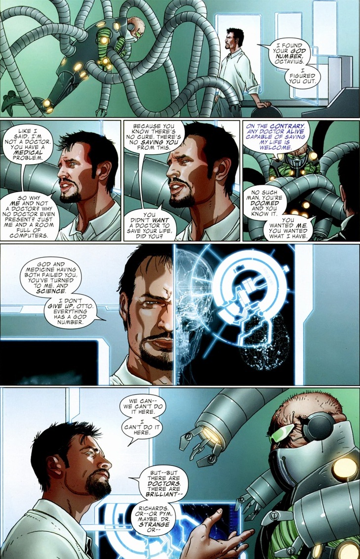 In Invincible Iron Man #501-503, written by Matt Fraction and drawn by Salvador Larroca, we see the two scientists at their peak with dangerously high stakes — like most science competitions I imagine. Doc Ock gets Stark’s attention the only way a supervillain should.