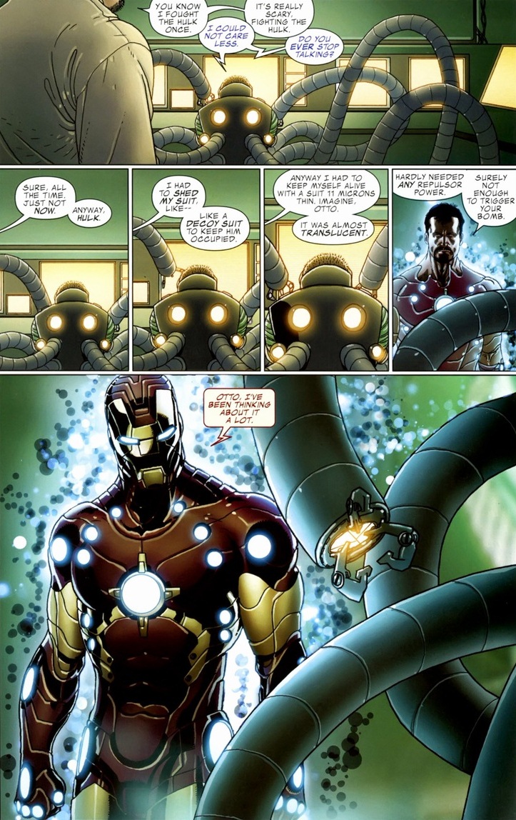 Unpredictability and back up plans for back up plans have made Doc Ock one of the most dangerous Spider-Man villains, with his metallic arms usually the least powerful of his weapons. And when Stark faces the situation at hand, he realizes the truth: he just lost to Doctor Octopus. So now, how’s he going to get the bomb disarmed? Remember that other option Stark had back in the beginning of the story?