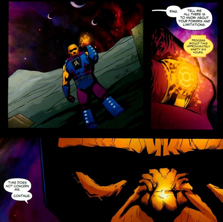 Anyway, with the yellow power ring — just like the Green Lantern ones except they run off of fear — he does the responsibly evil thing. Conquer lots of planets and take control of the Sinestro Corps: