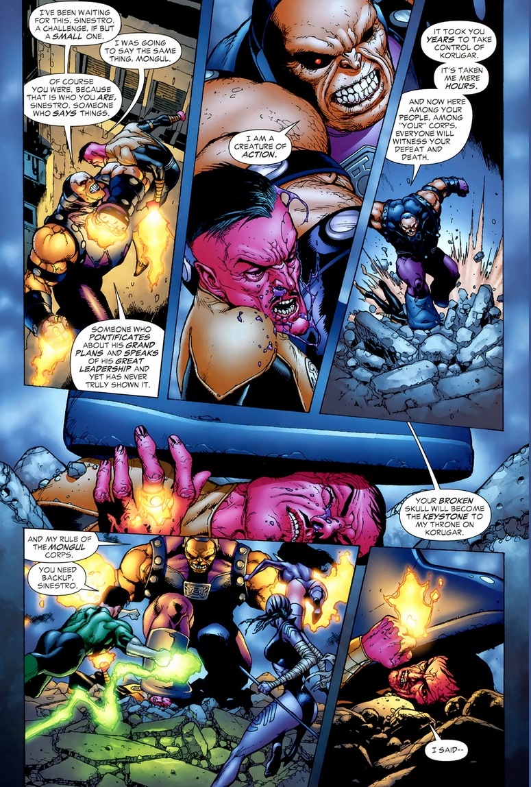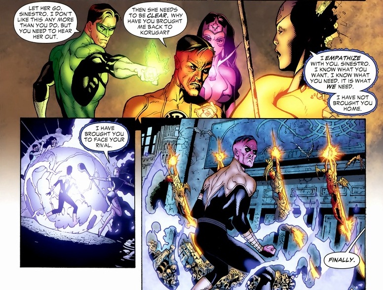 If you know Sinestro’s back story, he used to be the greatest Green Lantern of them all. Until his pupil and handsome Earthling Hal Jordan discovered Sinestro was using the ring to conquer and brutally rule his home planet for his own selfish desires. Much like what Mongul’s doing now. It’s not as if Sinestro’s morality has changed, it’s just he believes that if anyone should cause endless pain and suffering to Korugar, it should be a Korugarian.