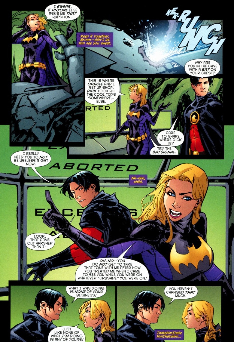 We jump forward more than a decade to Batgirl #8, written by Brian Q. Miller and drawn by Talent Caldwell.  Stephanie has since taken over the role of Batgirl from Cassandra Cain and Tim struck out on his own as Red Robin.