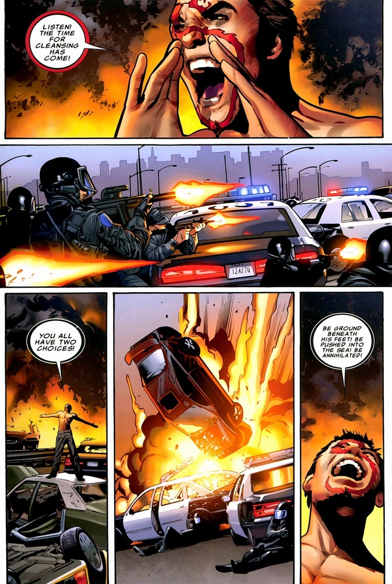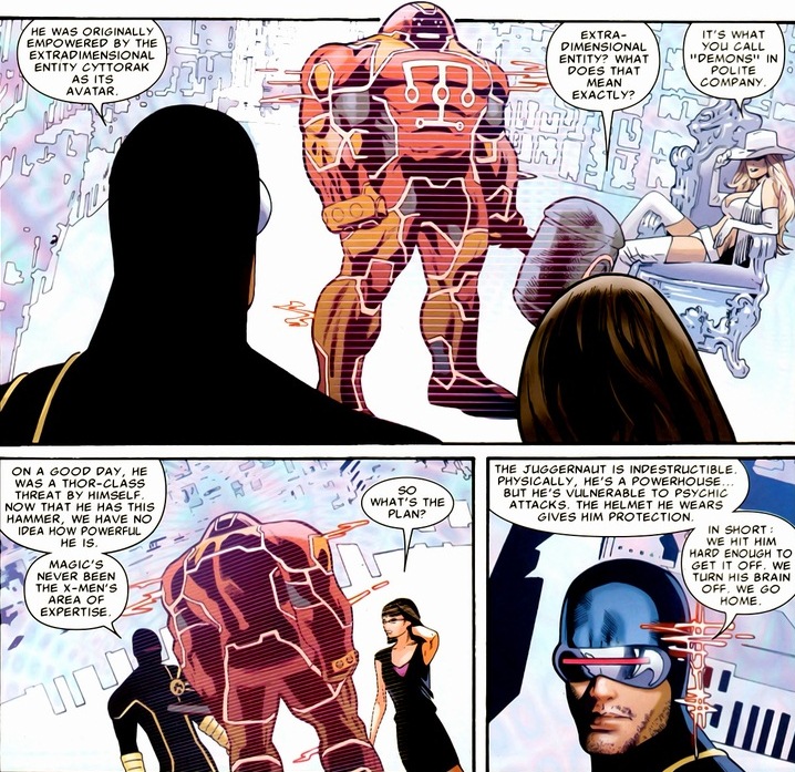 That’s Emma Frost in a cowboy outfit. Emma being Emma. Think the power of Jean Grey with none of the vices like modesty or prudence. As usual, fights like the one about to happen always start off the same. Cyclops will take his A-team into battle and see how they fare. Test the waters. You probably know how this is going to go.