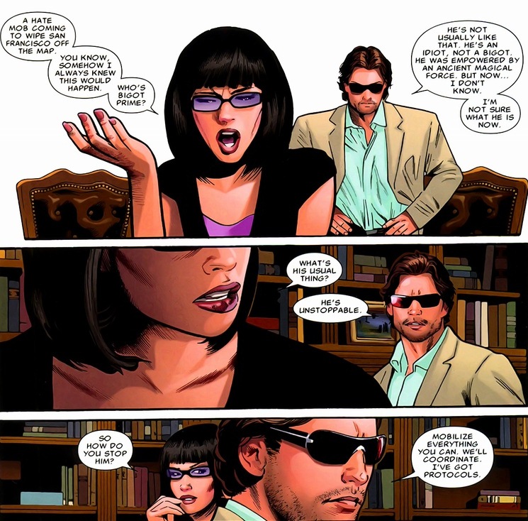 With a rampaging Juggernaut heading towards the X-Men’s base of operations near San Francisco, it’s time for America’s favorite mutants to jump into action. Also, I guess to deal with that half-naked oracle as well. First, Cyclops and the mayor of San Francisco have a combat briefing. Polite diplomacy and all.