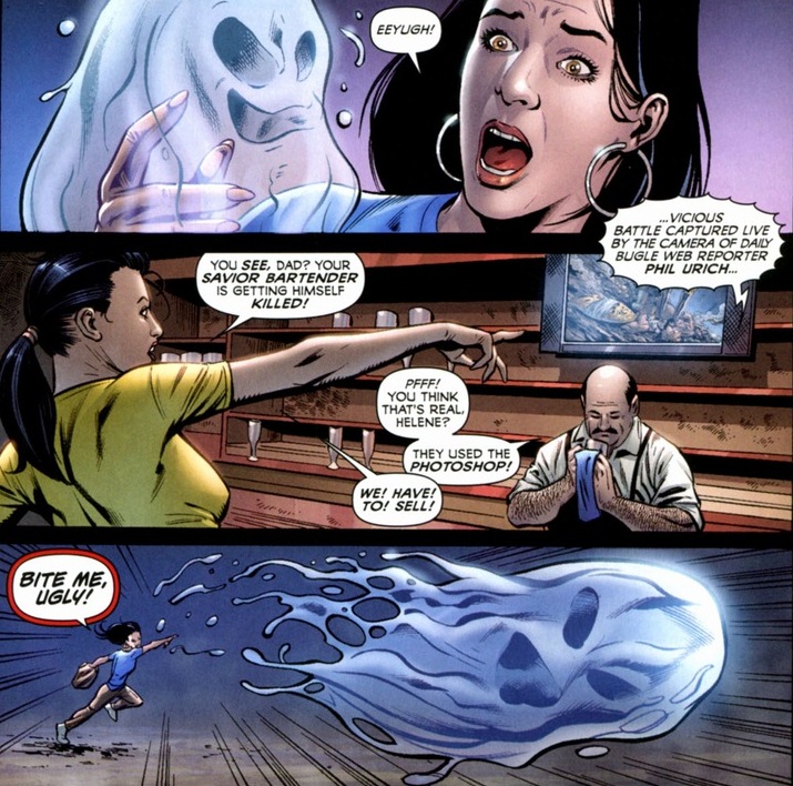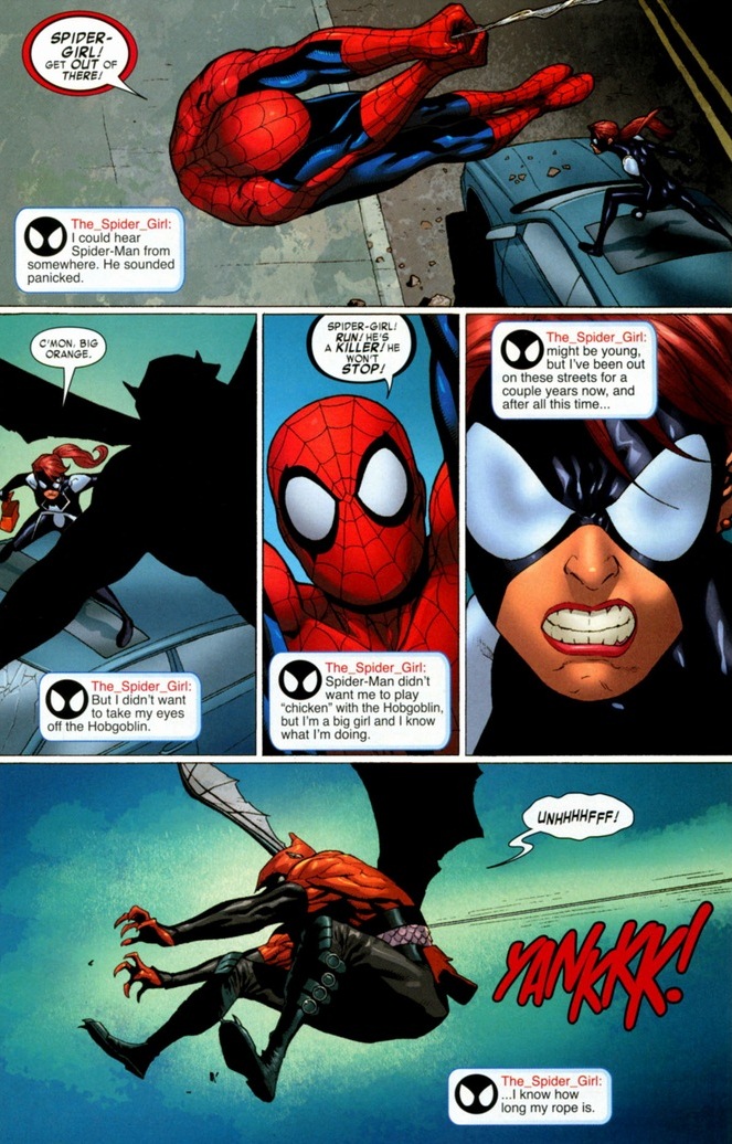 Why’s this Hobgoblin so much deadlier than his predecessors? Turns out Phil Urich (his real name) ingested some Green Goblin juice back in the day, giving him the ability to paralyze his opponents by laughing. Spider-Man beat this by inventing a special suit that reflects sound waves or something. I don’t really do a large amount of science-related research. Poor Spider-Girl has to use less impressive methods.
