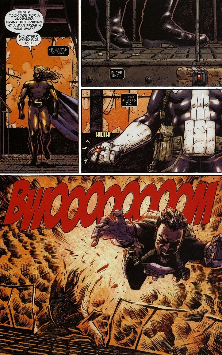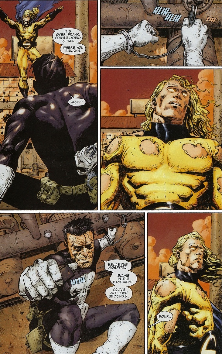 You know Castle doesn’t kill innocents.  Sure, he tortures and brutally murders bad guys, but all the lovely law-abiding folks have nothing to fear.  Sort of qualifications for being a superhero.  But if the Punisher knows the Sentry can reach and diffuse the bomb in time?  The game changes.