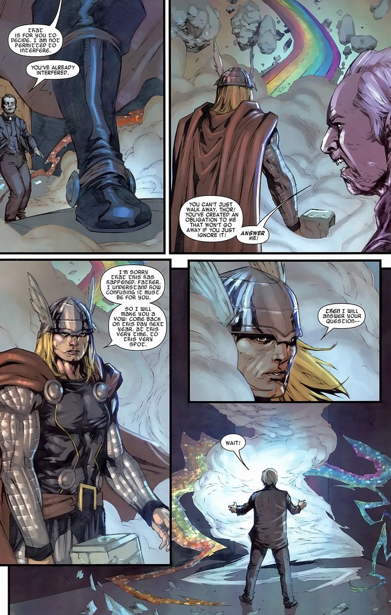 There’s no punching today.  Instead, we’re going to discuss a single inquiry asked of our god of thunder. Enjoy a beautifully done, well-crafted moment, and understand any answers I attempt to give will in no way be properly articulated.  But that shouldn’t stop us from trying.  In the mini-series Thor: Heaven & Earth, wonderfully written by Paul Jenkins and drawn by Pascual Alixe, Thor and gang go on little missions filled with just as much violence as intellectualism.  In issue #3, we’re faced with this heartbreaking situation: