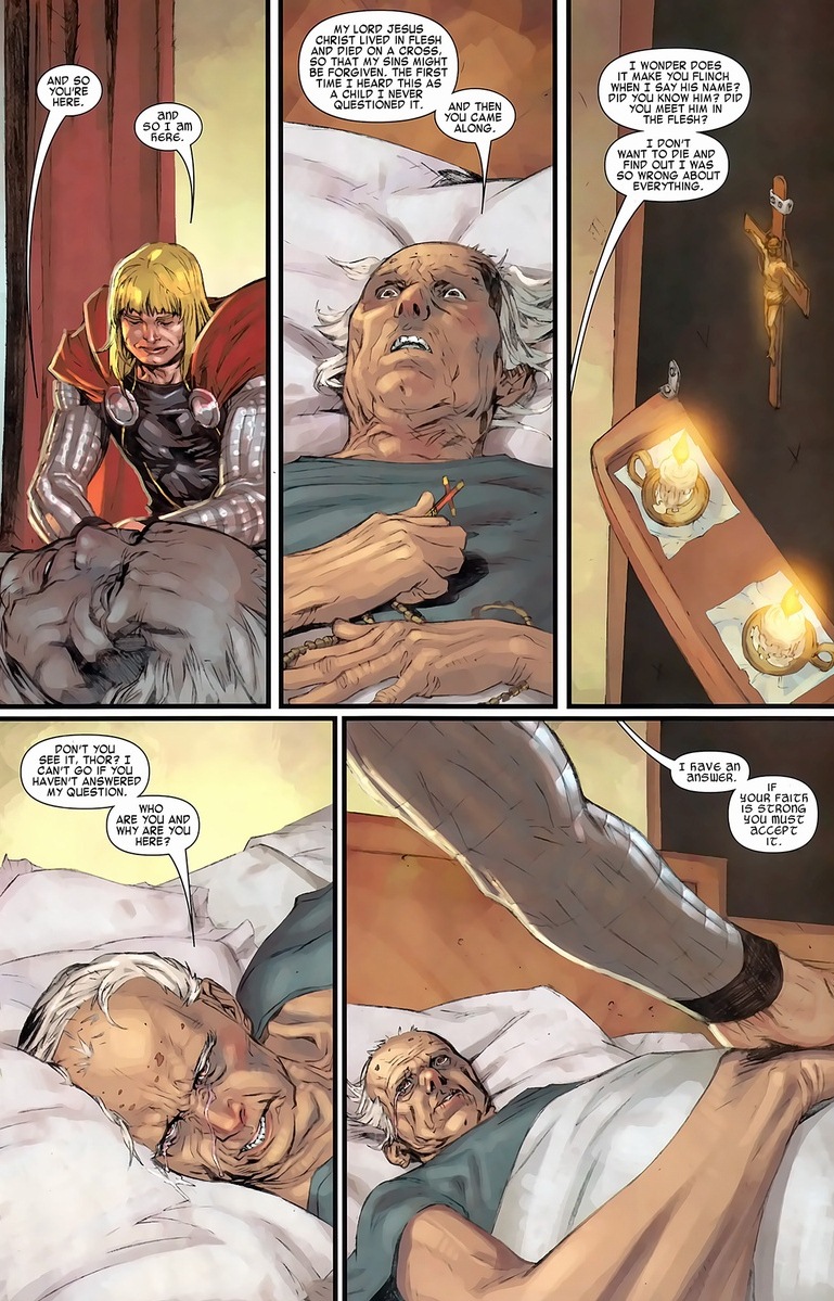 But a shrug and tough-luck pat on the shoulder won’t work.  As this priest lies on his deathbed four years after this initial meeting, Thor can only come to one conclusion.