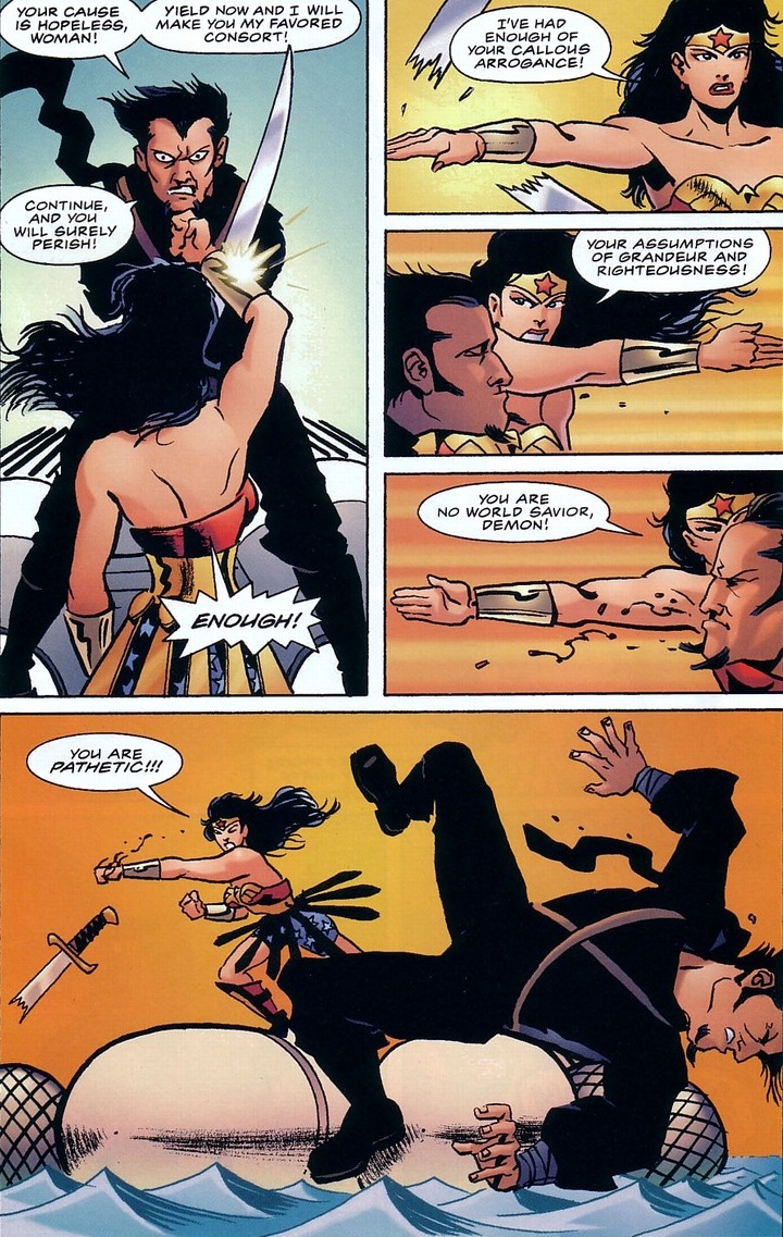 From a superpower perspective alone, Wonder Woman shouldn’t have a terribly hard time dealing with Ra’s.  The man has 600 years of combat experience, but he’s still non-powered.  And unfortunately, Wonder Woman doesn’t have that convenient kryptonite weakness.  So for the sake of story, we’ll assume Ra’s centuries of training make him an even match for the daughter of Zeus, which is fairly feasible for comics.  Bring on the continuity anger — I’m totally going with her New 52 origin.