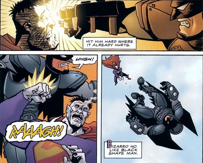 Let’s pause here.  Bizarro, the disfigured clone of Superman, has all of the Man of Steel’s power but with the mentality of a toddler.  Actually, a terrific combo for a supervillain.  Also, as you know from Batman comics before, the Dark Knight prefers to handle his own rogue gallery and tends not to pawn them off.  Finally, Wonder Woman can certainly match Bizarro’s speed and strength, so why send the fragile Batman instead of the hearty (is that offensive?) Amazon.
