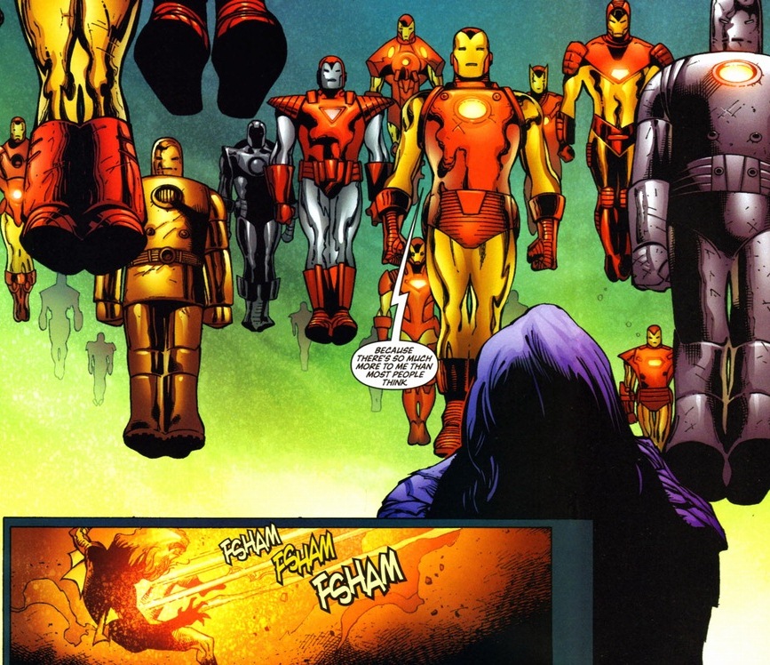 Eventually, since Super-Adaptoid has every Avenger power, Yelena remains relatively unharmed. So Iron Man uses his brain and figures if one Iron Man won’t be enough to take her down, how about forty?