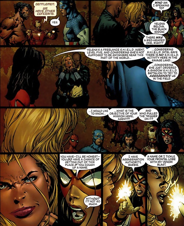 They team-up for the first time in the miniseries Black Widow #1-3, volume one, written by Devin Grayson and drawn by J.G. Jones, and Yelena moves on from her grudge. Better woman and whatnot. While never a major character, Yelena did get her own miniseries called Black Widow: Pale Little Spider and showed up a few times in other minor roles. Until New Avengers #6, written by Brian Michael Bendis and drawn by David Finch: