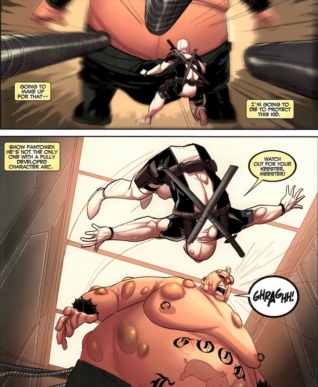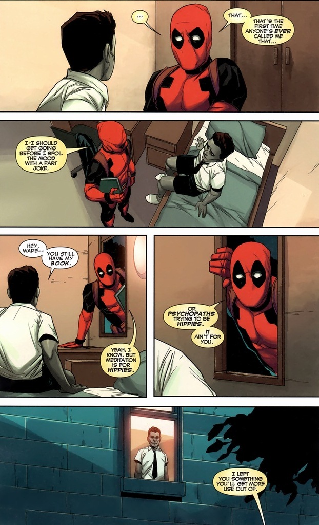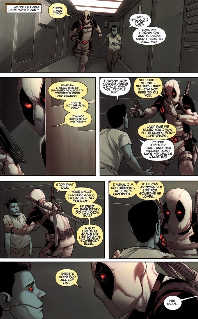One of the few times to see Deadpool being inspirational, and more importantly, correctly influencing the life of a child. Also, the white costume’s pretty cool, right? At this time, Deadpool lost his healing factor, making him doubly brave/stupid.