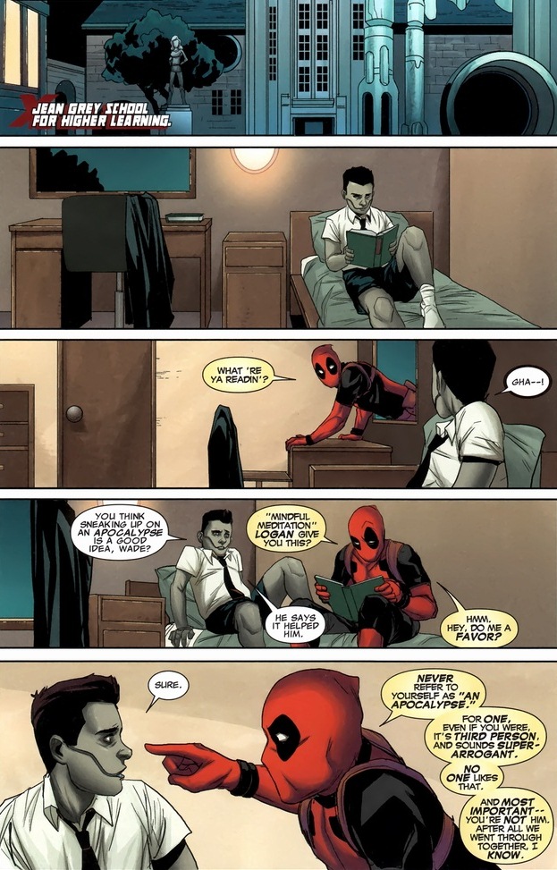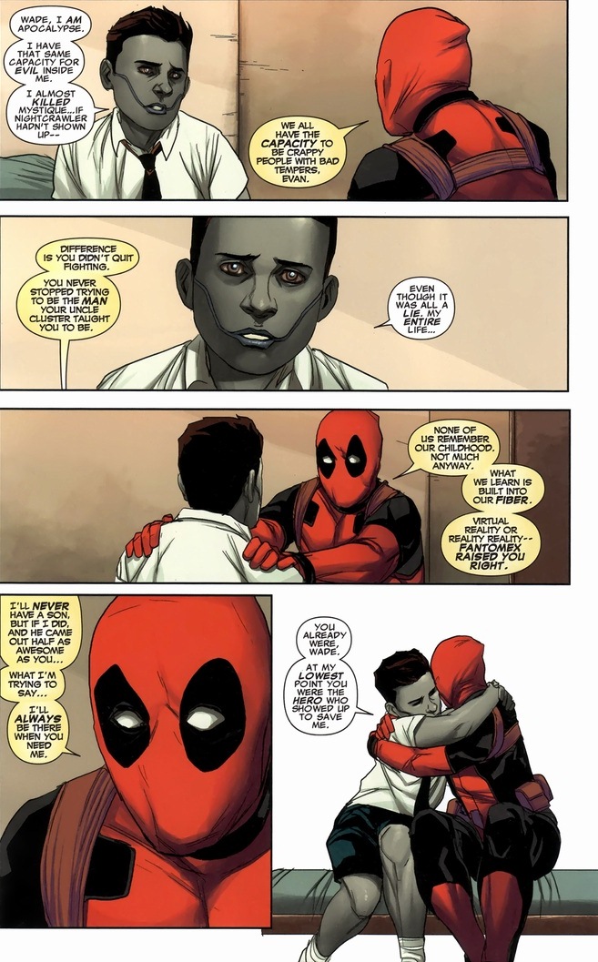 Deadpool’s most basic desire to be respected and loved by the Marvel universe remains one of the most common themes in his series. None of the superheroes really find the guy entertaining. Plus, he’s too unpredictable, morally bankrupt, unpleasant to look at, etc. But with Kid Apocalypse? You just saw a genuine moment — a moment in Deadpool’s life that isn’t insincere, but heartfelt love and respect. All the man has ever wanted given to him by the most powerful child in the Marvel universe.
