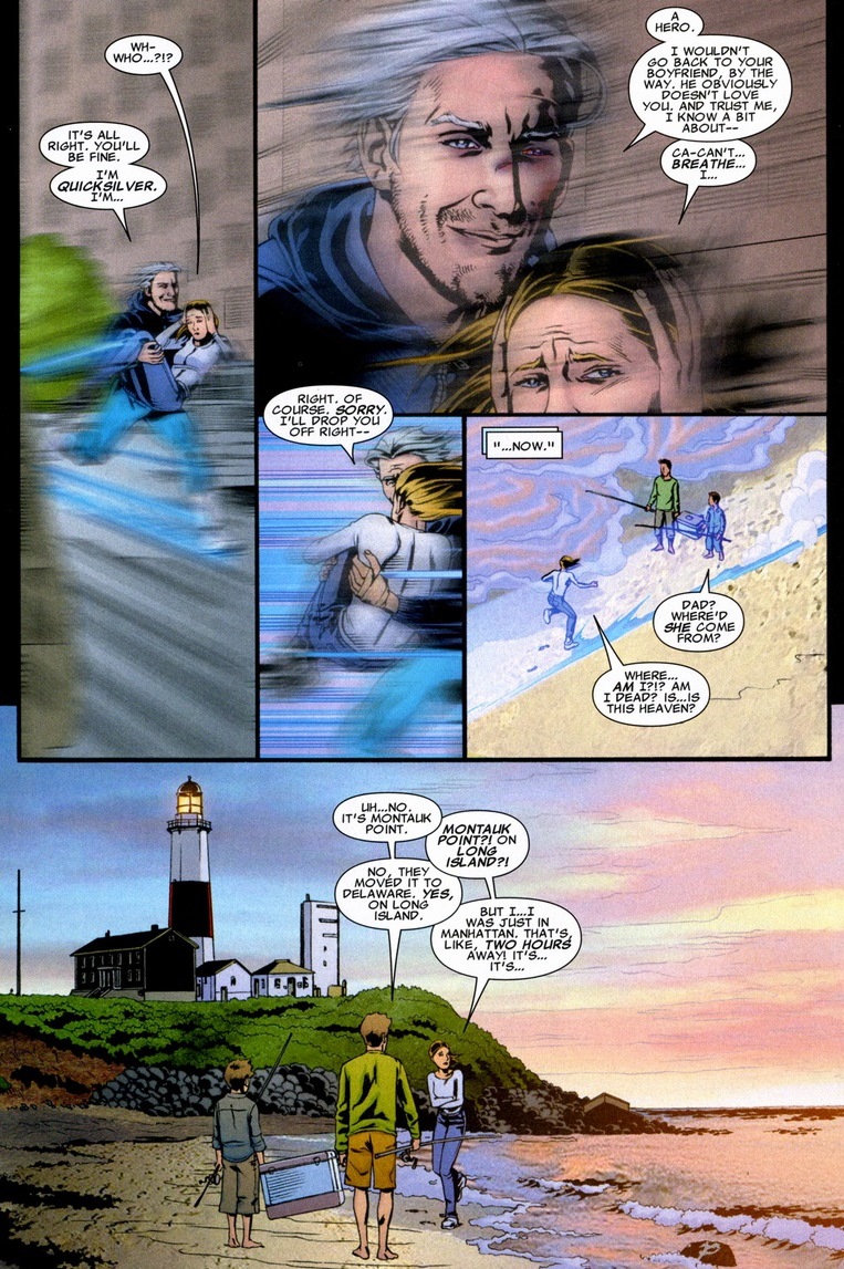 Today, we’re going to start with a scene from House of M #7, written by the amazing team of Brian Michael Bendis and drawn by Olivier Coipel.  While Quicksilver’s basically a rip-off of DC’s Flash, his sister can control and change reality through chaos magic and manipulation.  Like a genie or something, I guess.  In House of M, Scarlet Witch’s powers became overwhelming, forcing the Avengers and gang to decide how to best solve this problem.  Wolverine volunteered stabbing.  To protect herself, Magneto suggested Scarlet Witch create an alternative reality where everyone sings songs on the street and dances to show tunes.  But you know how alternative realities are, and things turned bad.  Oh, and the whole Magneto suggesting thing?  That’s not exactly true either: