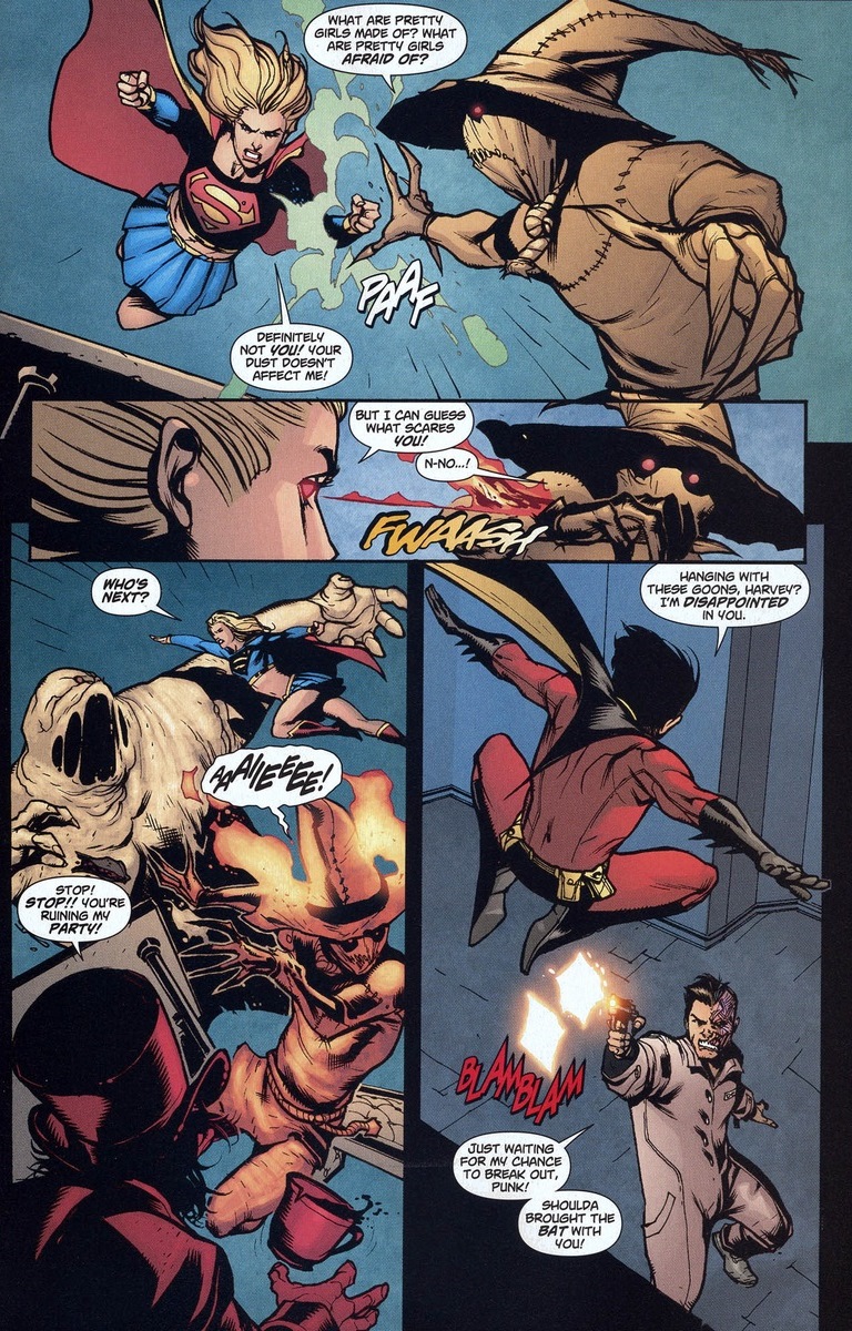 So the prisoners of Arkham Asylum released themselves and turned it into a sort of bloody haunted house. Commissioner Gordon gets to sits back while two teenagers bring out the supervillains one-by-one.