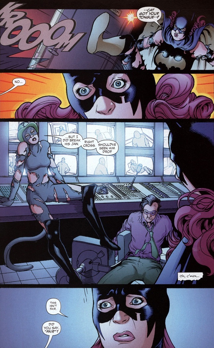 Catwoman teases in more ways than one. By the way, the Riddler should always top the list of supervillains you would most want to punch. He breathes in smug and breathes out ego, plus bowler hats should really only be worn by 1920s gangsters and 1950s private detectives.