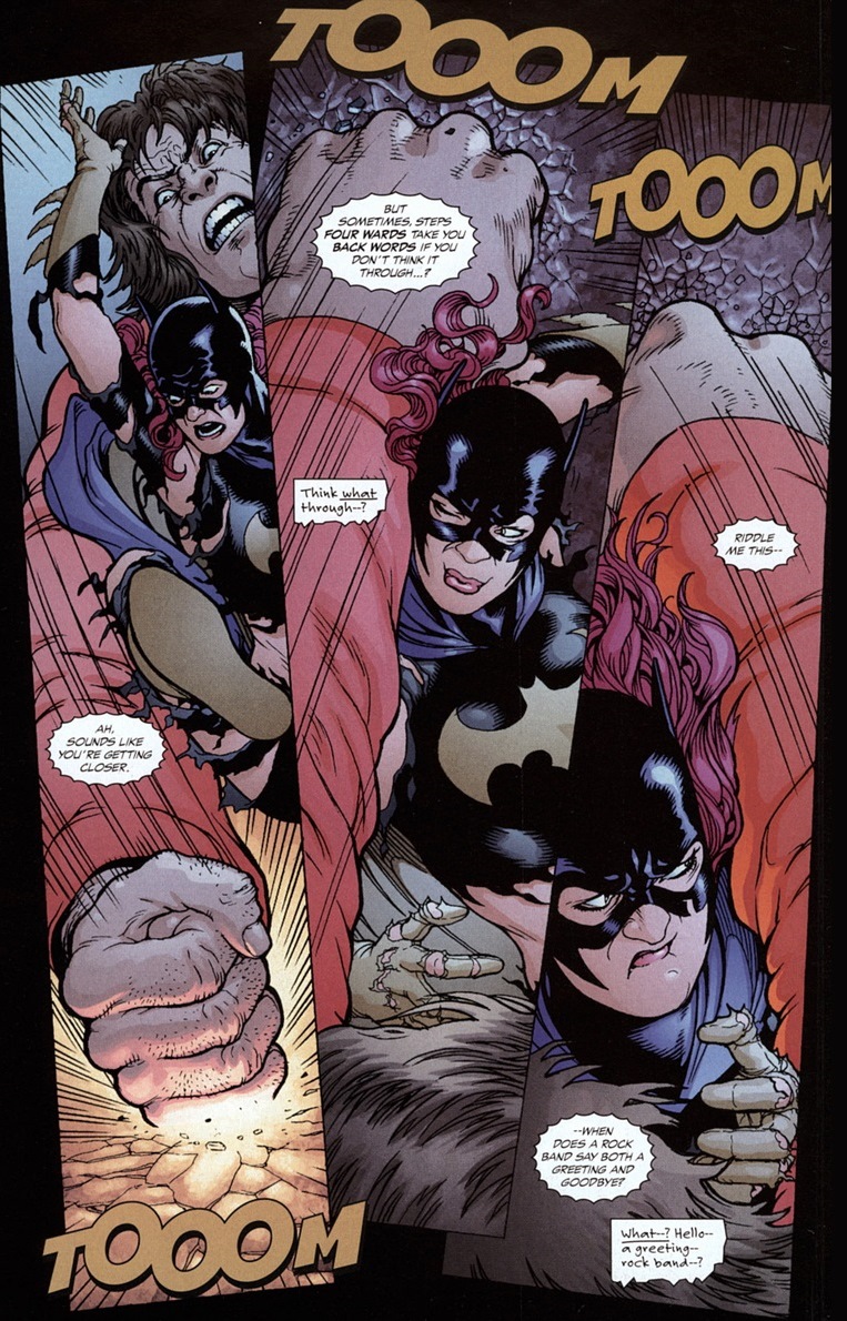 As you can tell from her costume, she’s had a rough night already. I’m actually picking up at the climax of this arc and unfortunately, this was back in the day when the Bat-family outfits consisted of less bulletproof material and more spandex. Alfred must be a hell of a seamster. Since Riddler’s known for his brains and not brawn, he figures that maybe the other inmates would like to handle the dirty work of beating up a teenage girl.