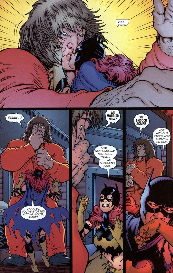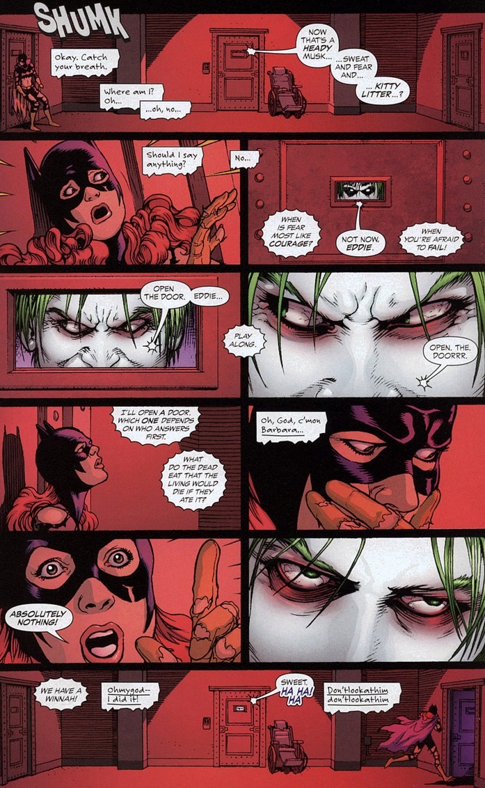 Starting in 2006, the series Batman Confidential decided to have rotating creative teams that explored Batman’s earliest memories — the ones where Robin didn’t wear pants. In Batman Confidential #20-21, written by Fabian Nicieza and drawn by Kevin Maguire, Batgirl (Barbara Gordon) is still relatively new to the whole crimefighting scene. Unfortunately, a pursuit of the Riddler led her straight into Arkham Asylum.