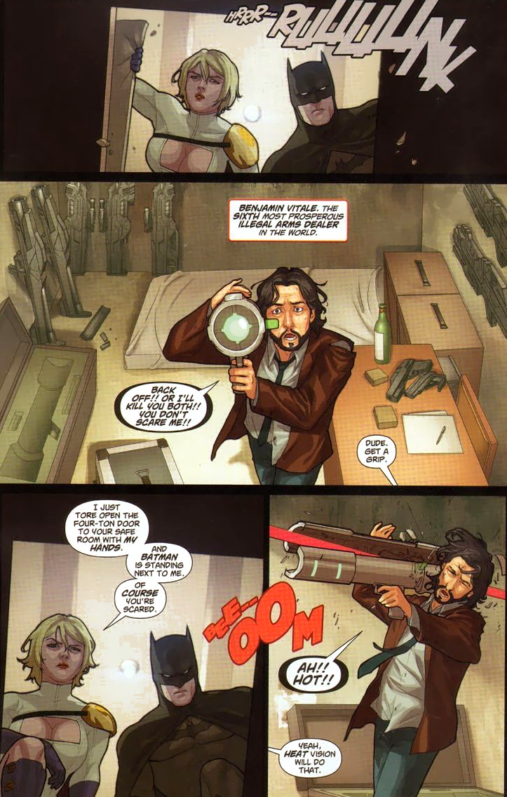 Remember, the main difference between Bruce and Dick remains that Dick allows himself to be happy sometimes. Also, Power Girl reacts to minions the same way most of us would if we shrugged off 99% of attacks.