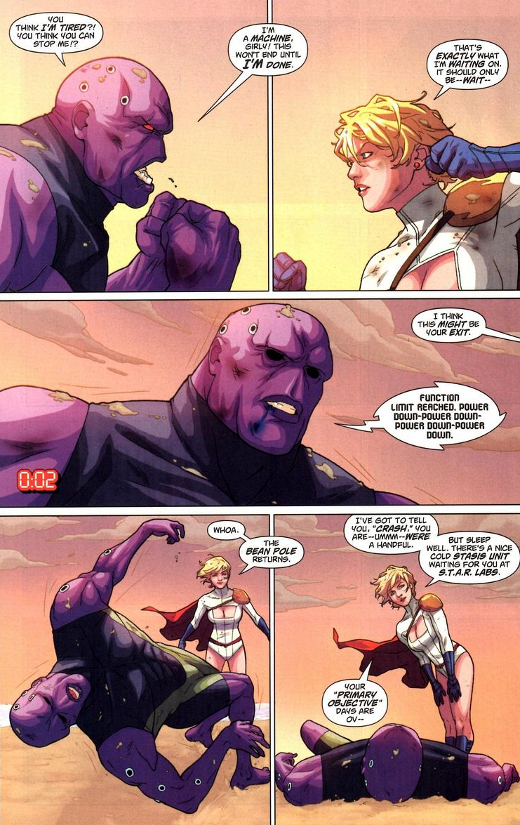 I wish I could say that Power Girl pulls off a brilliant tactical maneuver to overpower her foe and bring peace back to the weary city. Nope, instead, like many things in life, this battle’s about endurance. Her tech guy gives her the following advice: