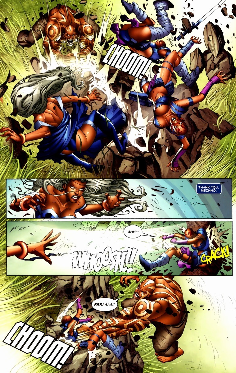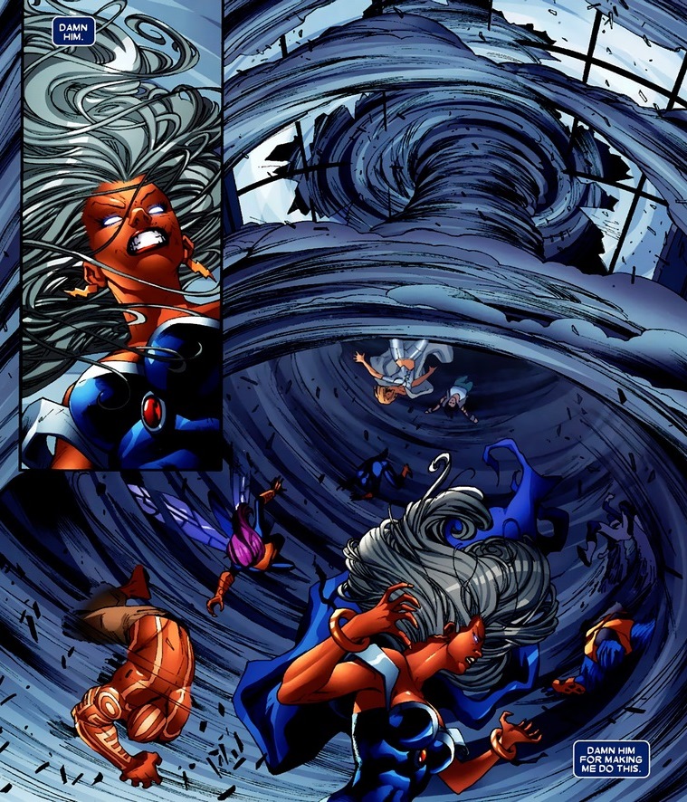 In the mid-2000s, turns out Storm and Black Panther (the king of the African nation Wakanda) loved each other back in their prepubescent days.  And as adults, they get married.  Romantic, definitely, but more importantly, Storm (real name Ororo Munroe) now presides over Wakanda as its queen. Predictably, ruling a small country takes up most of her time, straining her duties as an X-Man.  The miniseries deals with that problem, but we’re just going to focus on all the fighting.  If you want to see Storm destroy everyone, this is the article for you.