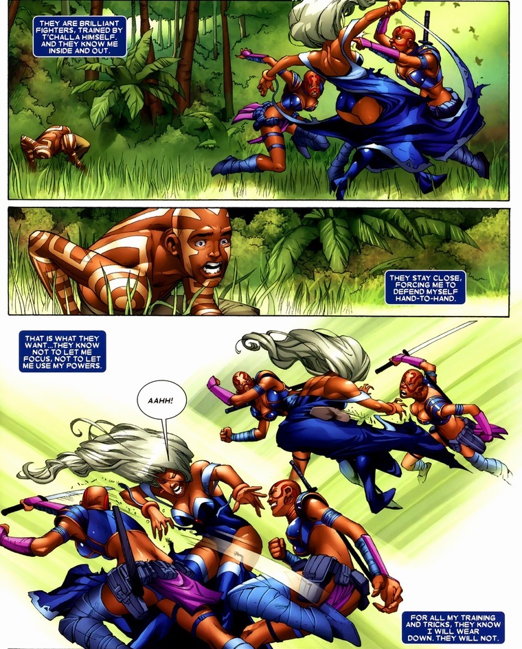 These comics were made to make Storm win and are a bit unrealistic. She also got hit in the face with the butt-end of a riffle, that could easily knock her out like it does to so many movie and tv show characters – after all she’s got the durability of an ordinary woman only.