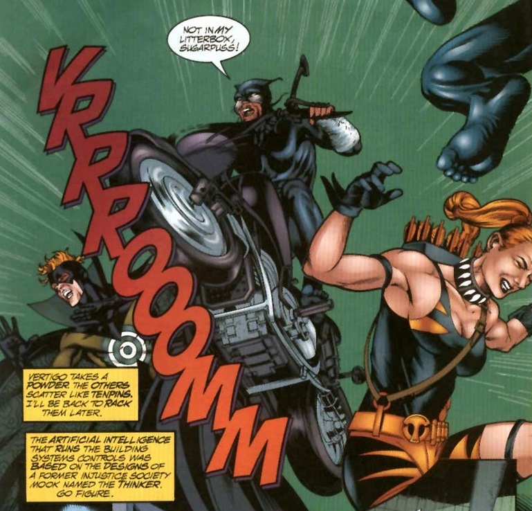 Count Vertigo goes down with a wheel in the face.  As Wildcat speeds off into the depths of the building, he decides to milk the bike’s usefulness.  I mean, you see how much use Ghost Rider gets with his?  And Wildcat has the added benefit that unlike Ghost Rider, his skull isn’t on fire.  More importantly, a motorcycle license may be the closest thing Grant has to a superpower.