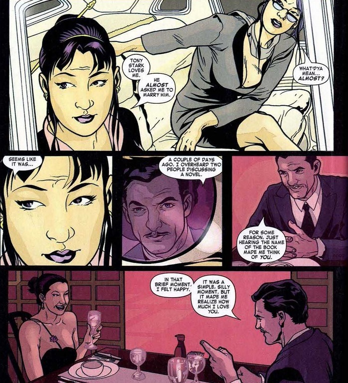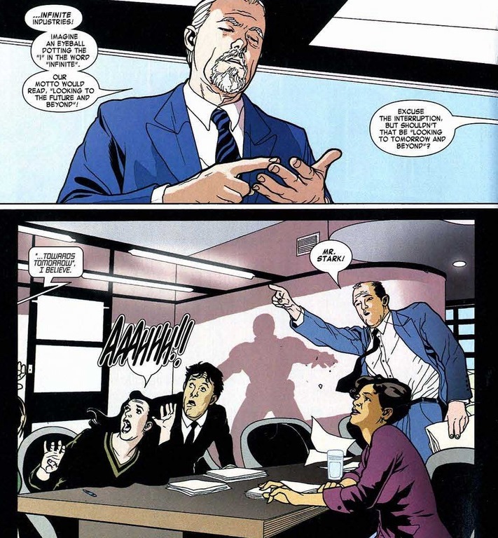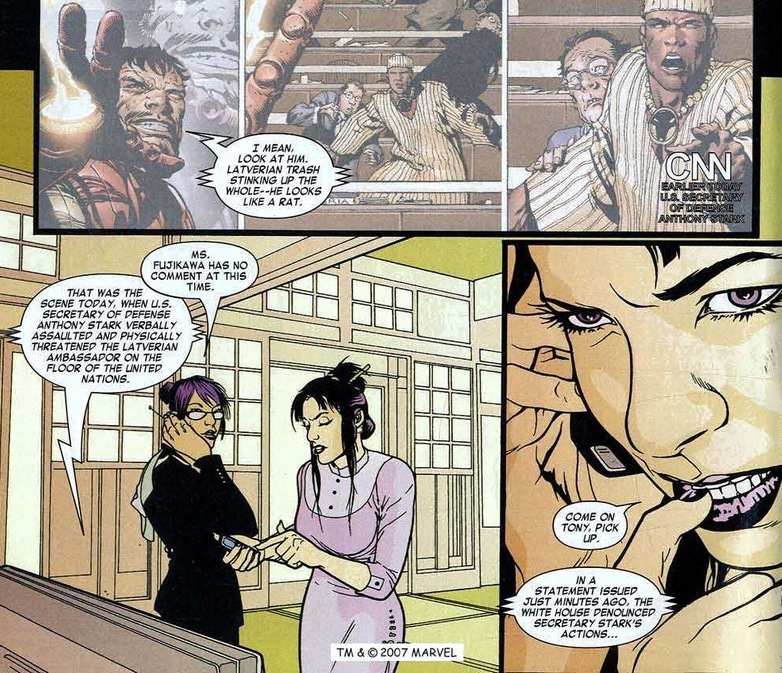 Meet Rumiko Fujikawa, Stark’s on-and-off love interest for the past eighty issues or so. They’re currently off, but after the public meltdown, Rumiko figures she might be useful in curing the rainbow of Iron Man’s emotional explosions. But first, we cut to Stark Industries headquarters. More problems arise than just stock prices: