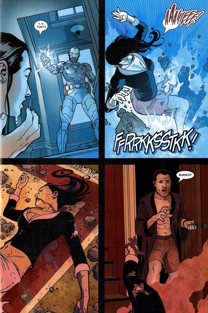 With Rumiko’s death, Stark now has to battle his impostor both overcome with grief and in his underwear. It goes as you expect.